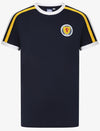 Celebrate your Scottish pride with this Official Team Scotland Ringer Tee. The classic contrast ribbed collar and cuffs frame the chest perfectly, while the woven Scotland crest adds authentic heritage appeal. Distinctive tap detailing on the sleeves completes the look with understated style. Perfect for match days or everyday wear, this navy essential connects you to the heart of Scottish football.